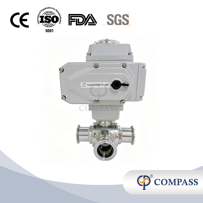Descripción del producto: Válvula de bola eléctrica sanitaria de acero inoxidable más vendida SS304 Válvulas de bola con puerto L de tres vías con abrazadera de 50,8 mm y cabezal eléctrico 220